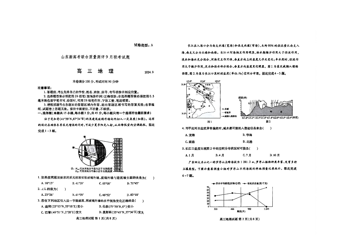 山东省新高考联合质量测评2025届9月联考试题地理