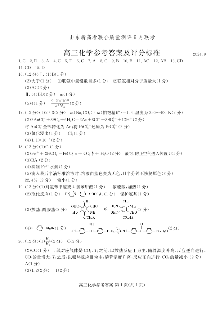 山东省新高考联合质量测评2025届9月联考试题化学答案
