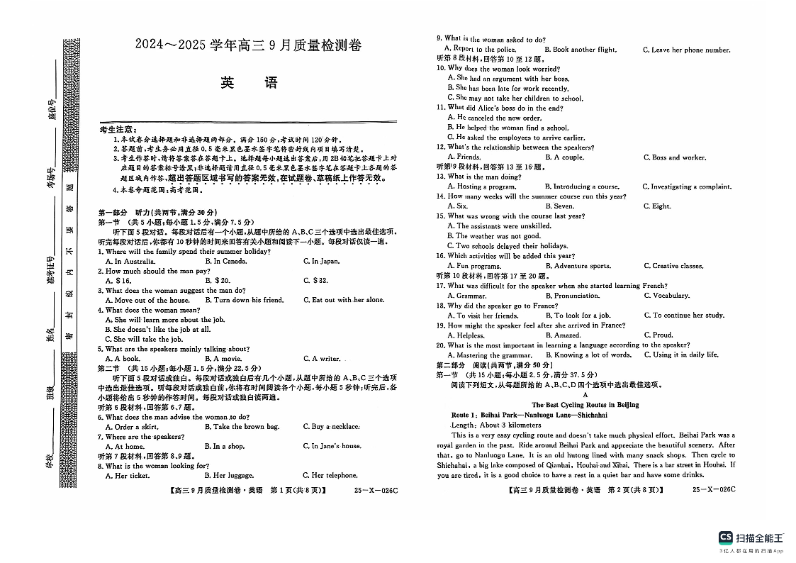 山西省部分高中2024-2025学年高三9月质量检测卷英语