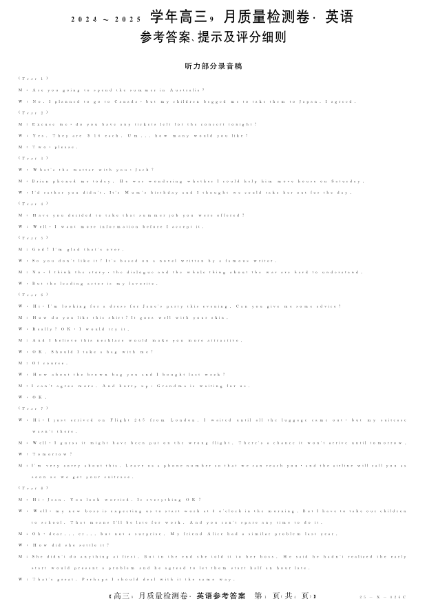 山西省部分高中2024-2025学年高三9月质量检测卷英语答案