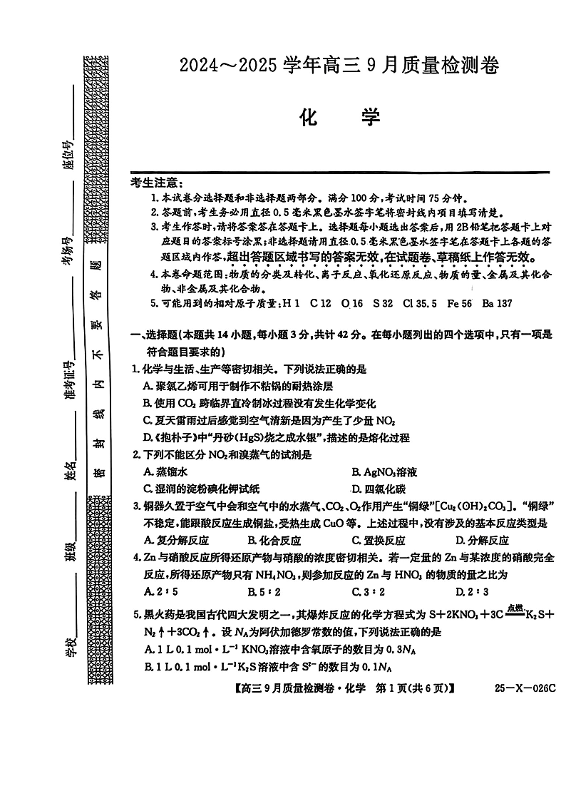 山西省部分高中2024-2025学年高三9月质量检测卷化学
