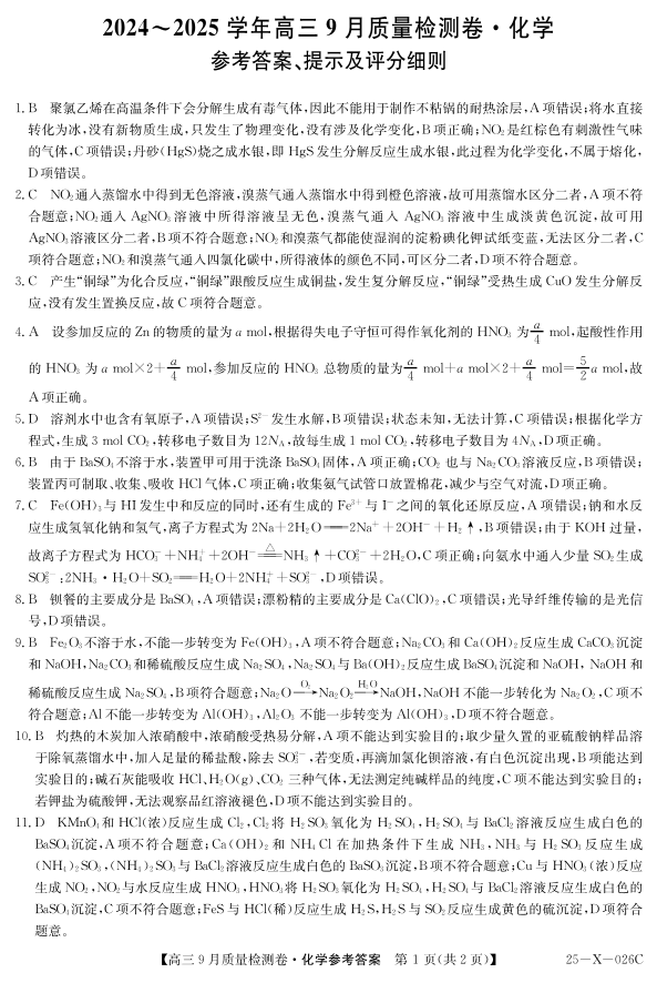 山西省部分高中2024-2025学年高三9月质量检测卷化学答案