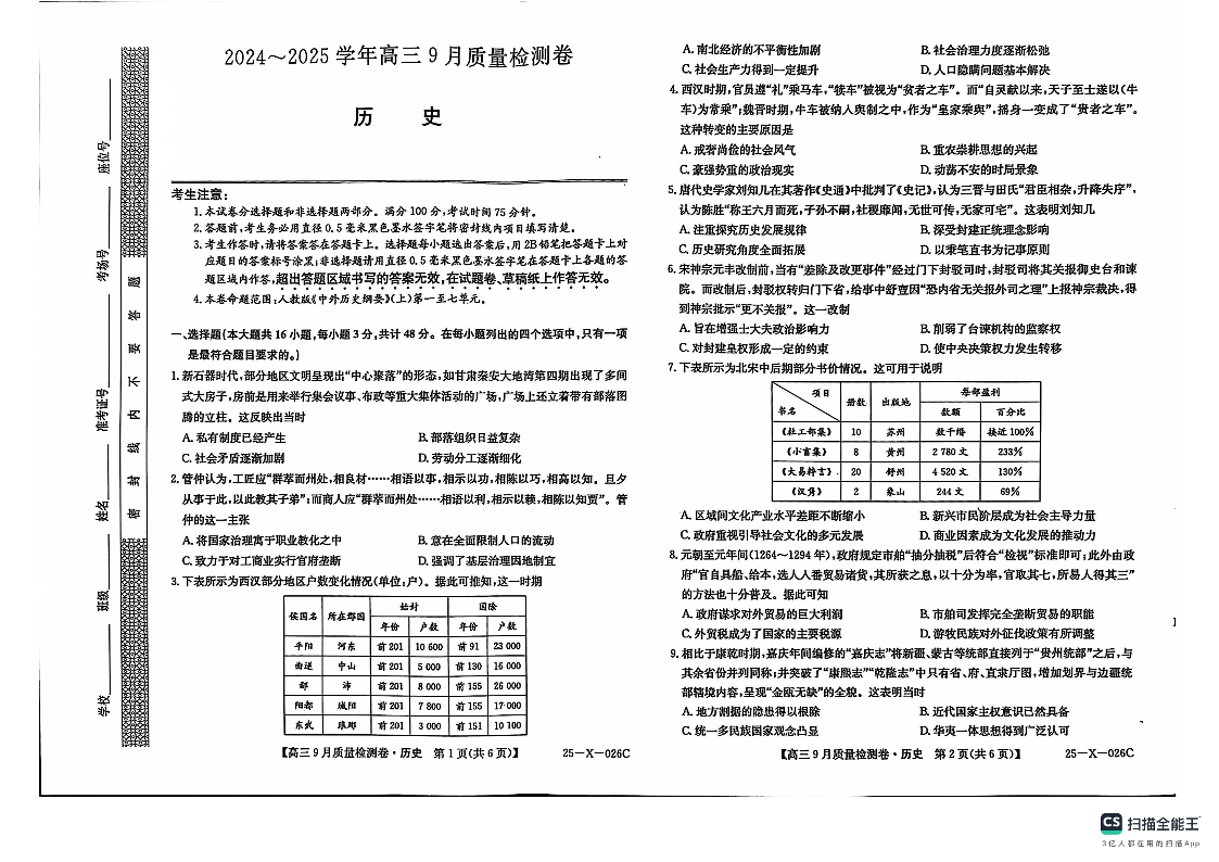 山西省部分高中2024-2025学年高三9月质量检测卷历史