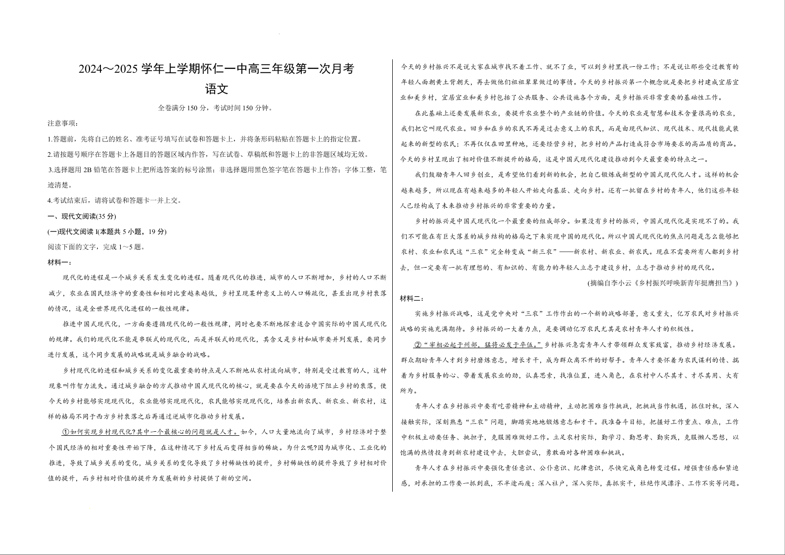 山西省朔州市怀仁市第一中学校2024-2025学前上学期高三年级第一次月考语文