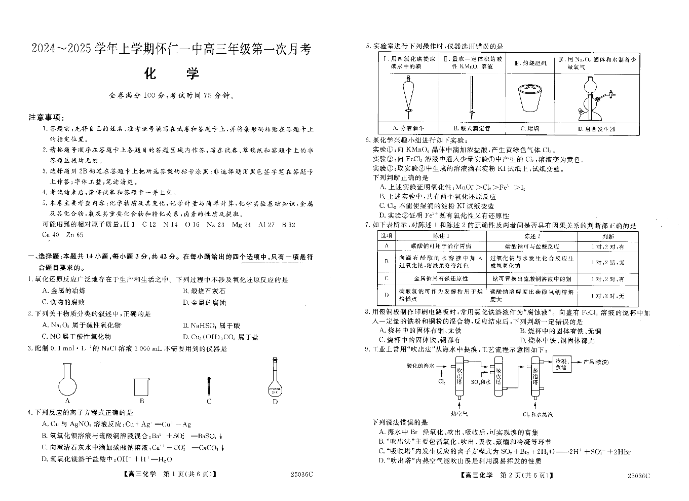 山西省朔州市怀仁市第一中学校2024-2025学前上学期高三年级第一次月考化学