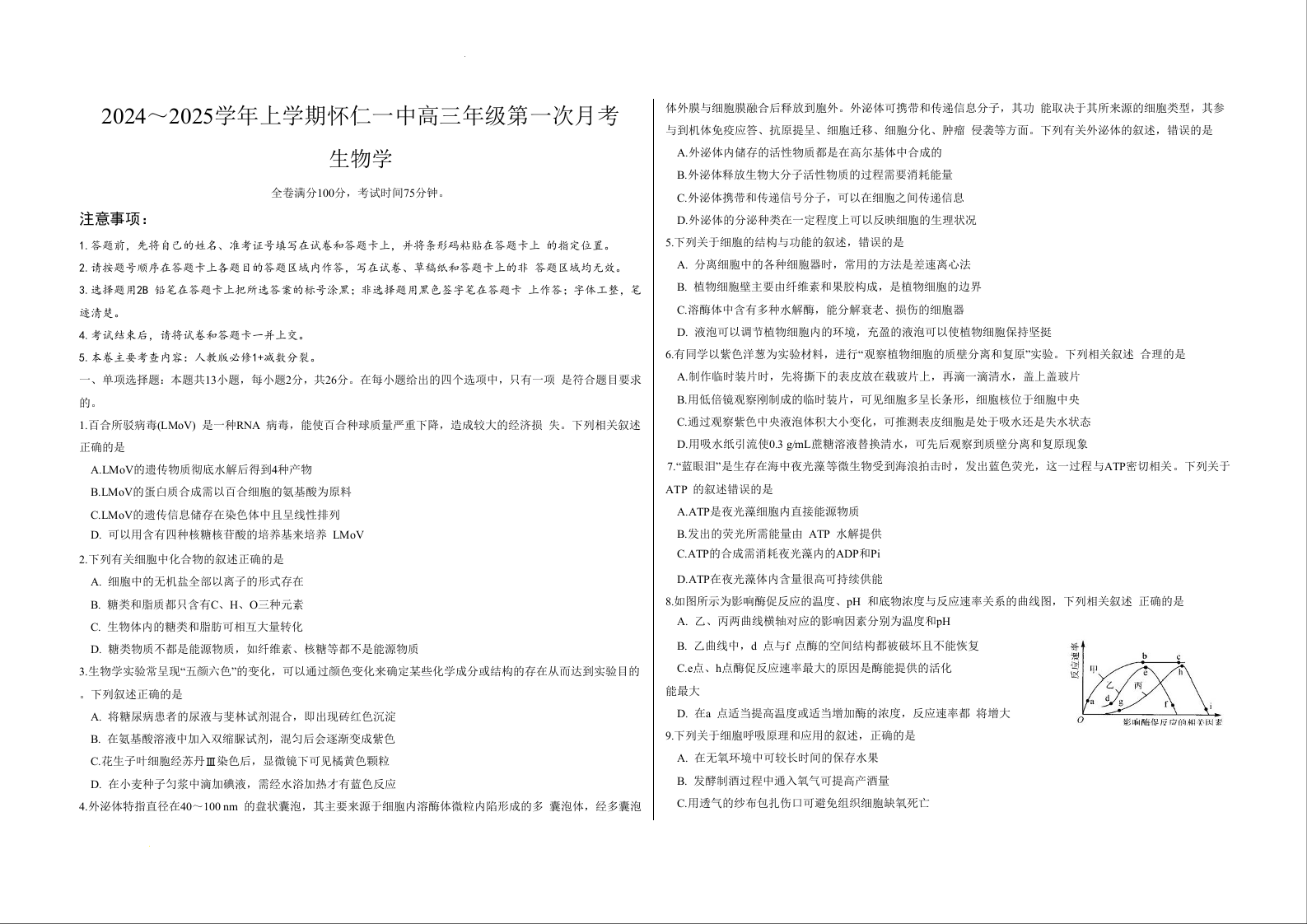 山西省朔州市怀仁市第一中学校2024-2025学前上学期高三年级第一次月考生物