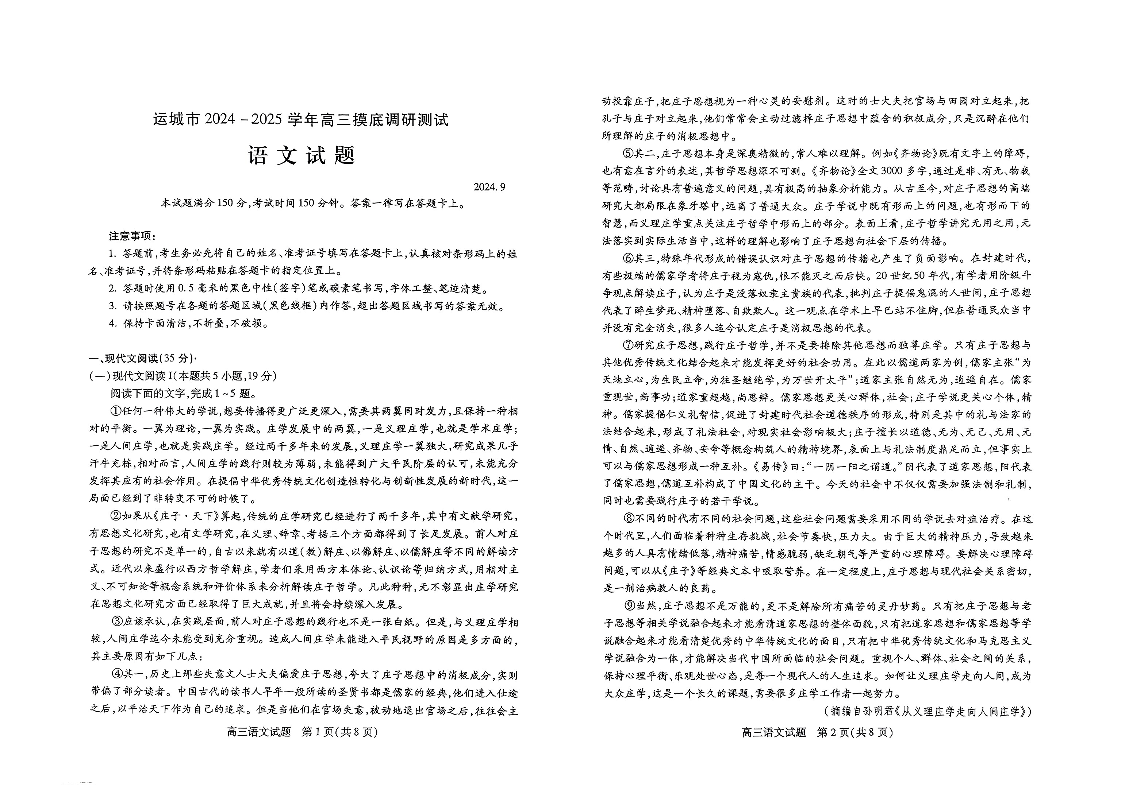 山西省运城市2024-2025学年高三摸底调研测试语文