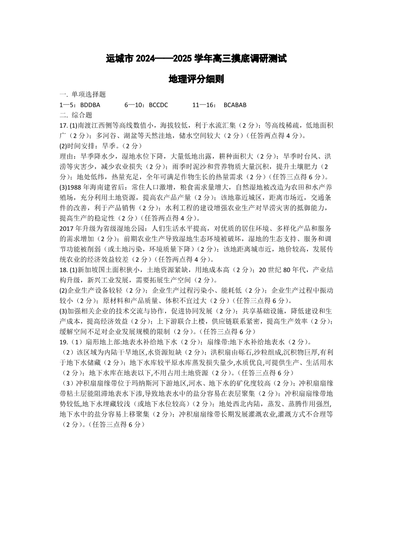 山西省运城市2024-2025学年高三摸底调研测试地理答案