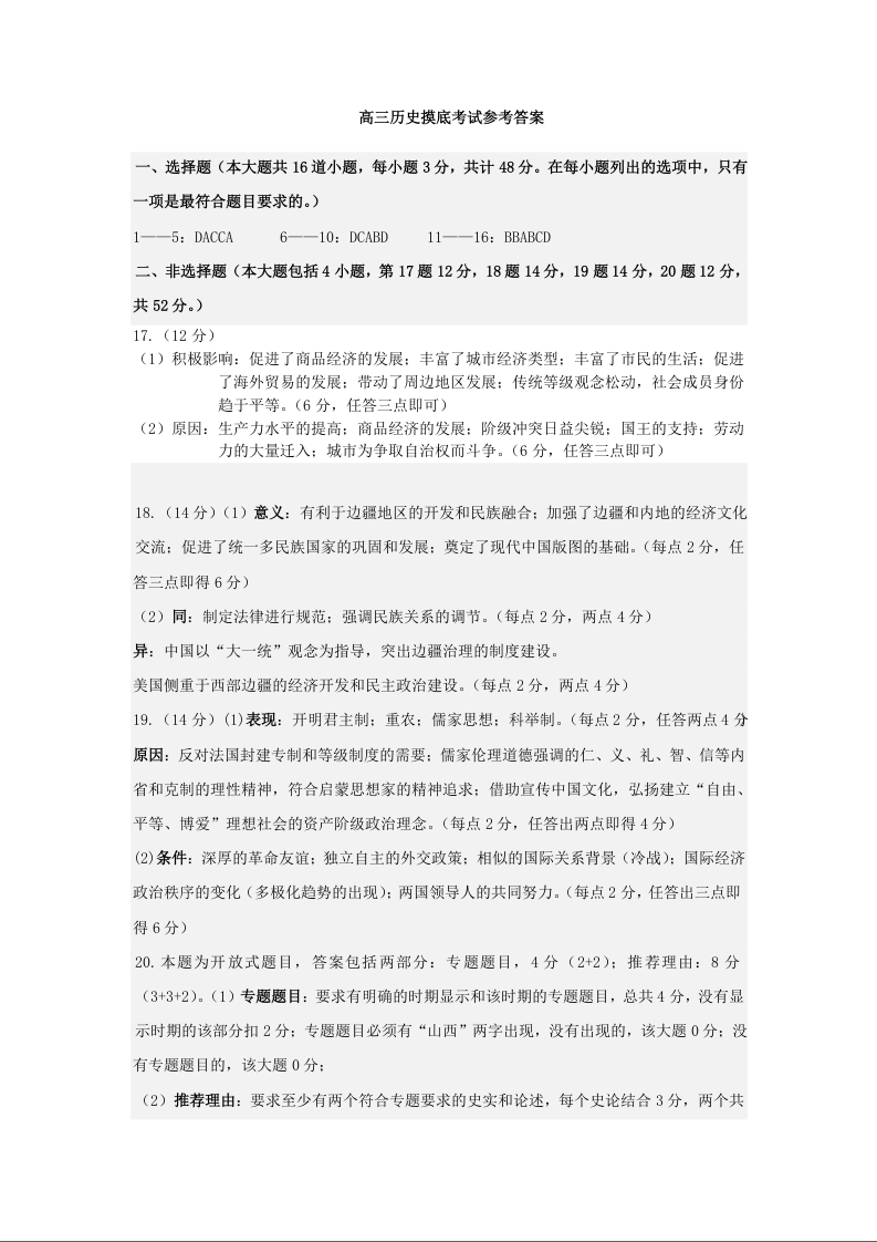 山西省运城市2024-2025学年高三摸底调研测试历史答案