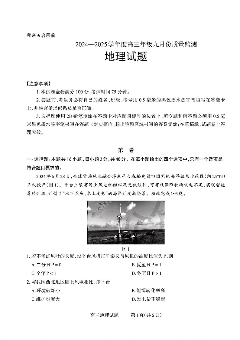 山西长治市2024-2025学年度高三年级九月份质量检测试题地理