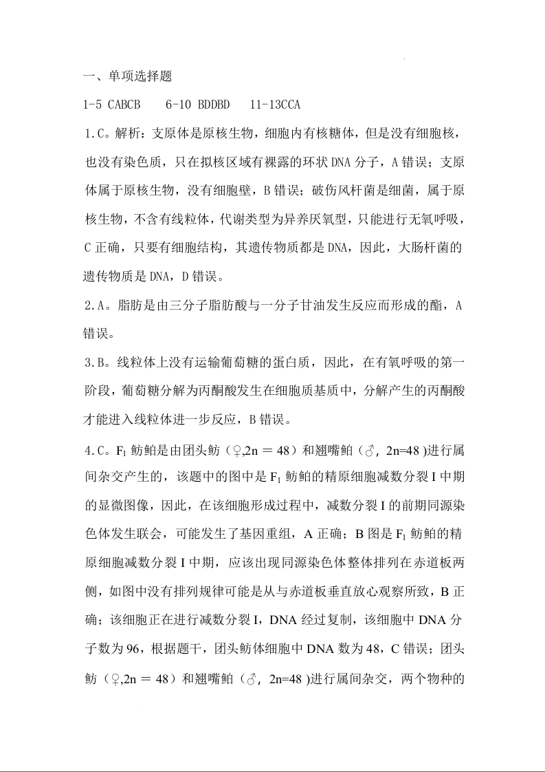 山西长治市2024-2025学年度高三年级九月份质量检测试题生物答案
