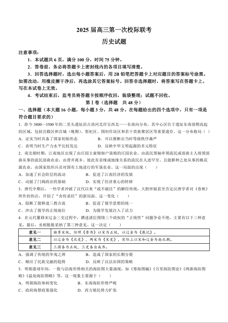 陕西省2025届高三第一次校际开学联考历史+答案