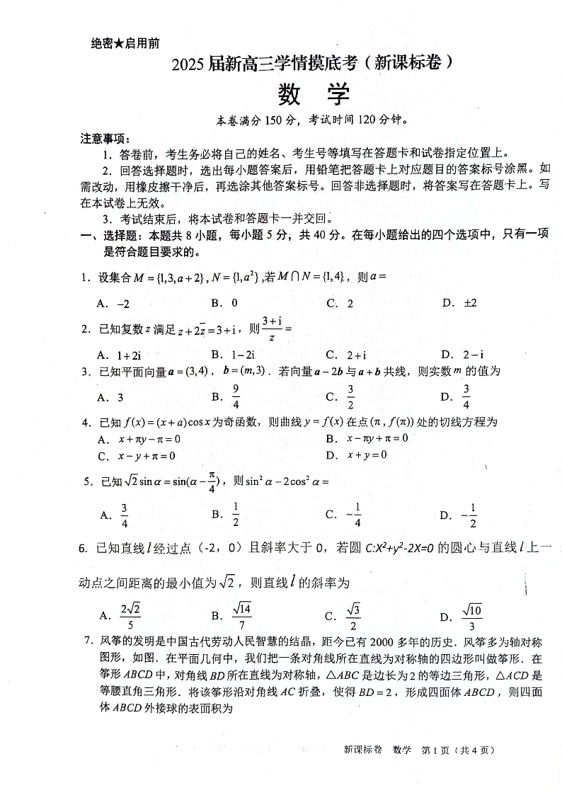陕西省安康市2025届新高三学情摸底考(新高考卷)数学+答案