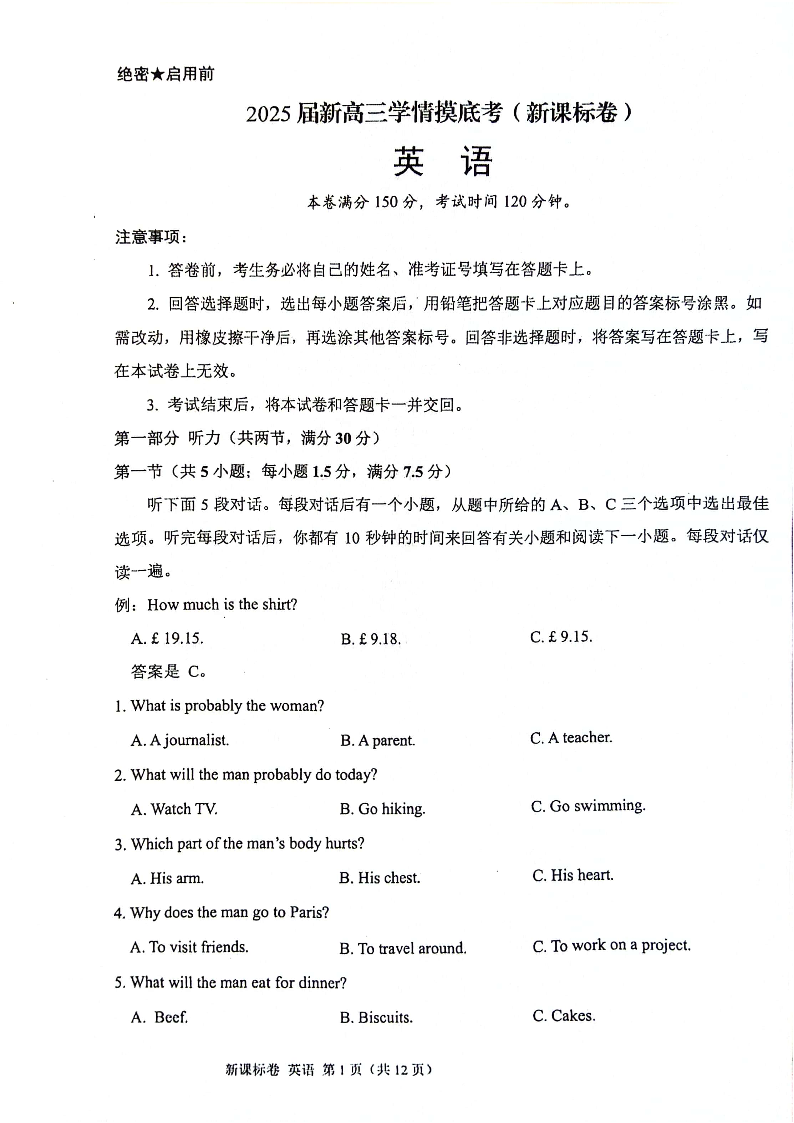 陕西省安康市2025届新高三学情摸底考(新高考卷)英语试题+答案