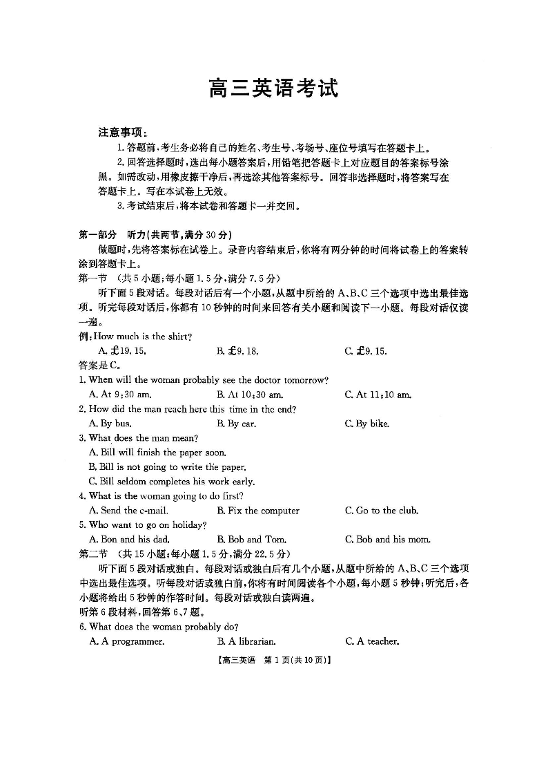 陕西省部分学校高三年级2025届9月联考英语