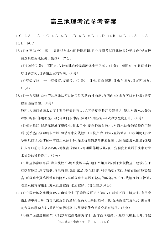 陕西省部分学校高三年级2025届9月联考地理答案