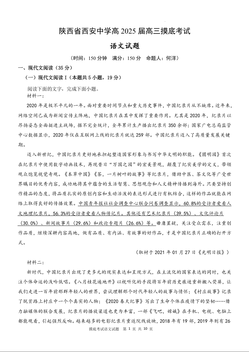 陕西省西安中学高2025届高三摸底考试语文