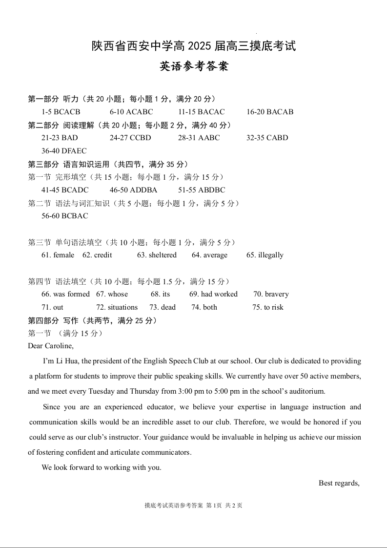 陕西省西安中学高2025届高三摸底考试英语答案