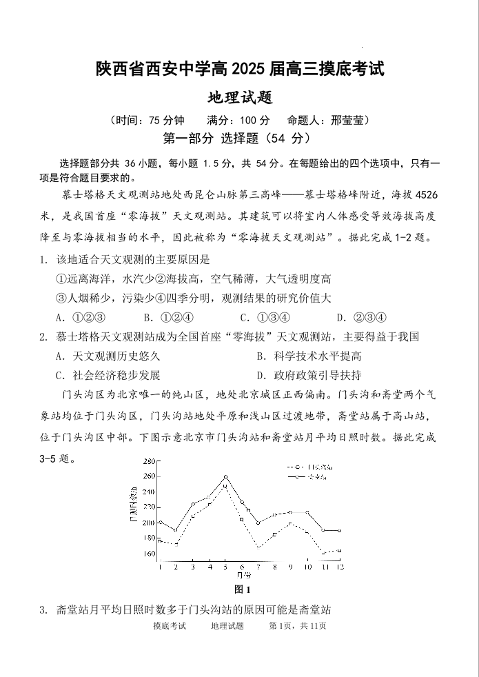 陕西省西安中学高2025届高三摸底考试地理
