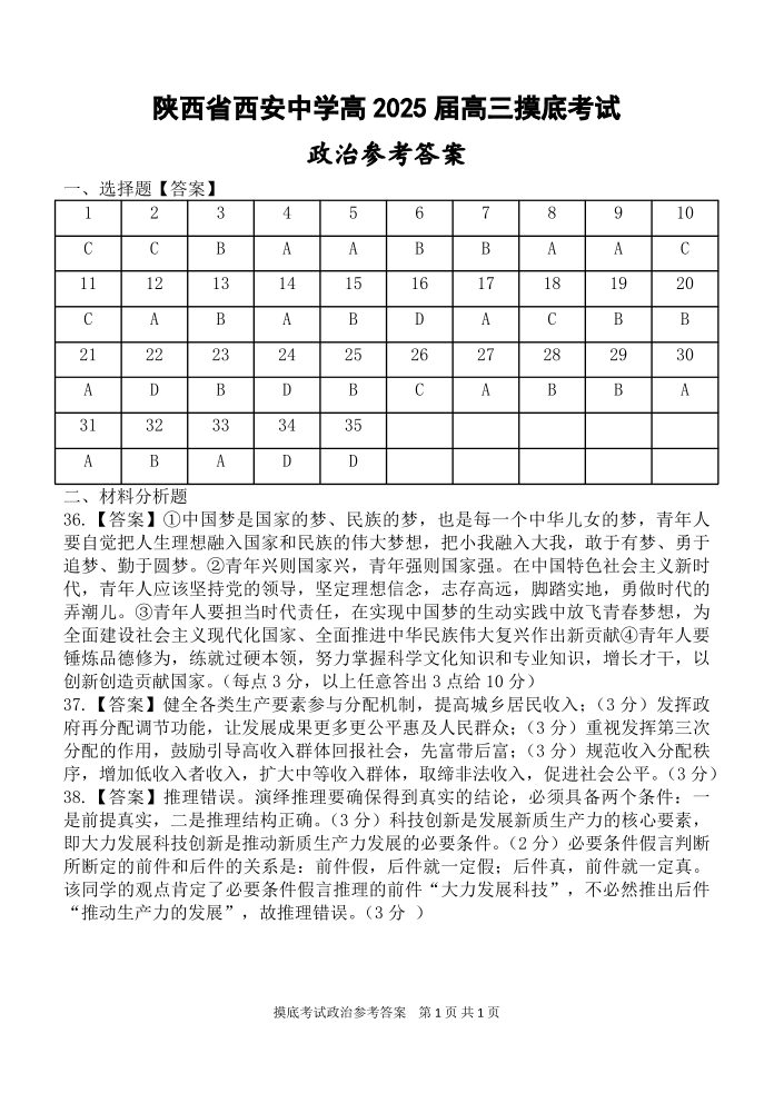 陕西省西安中学高2025届高三摸底考试政治答案