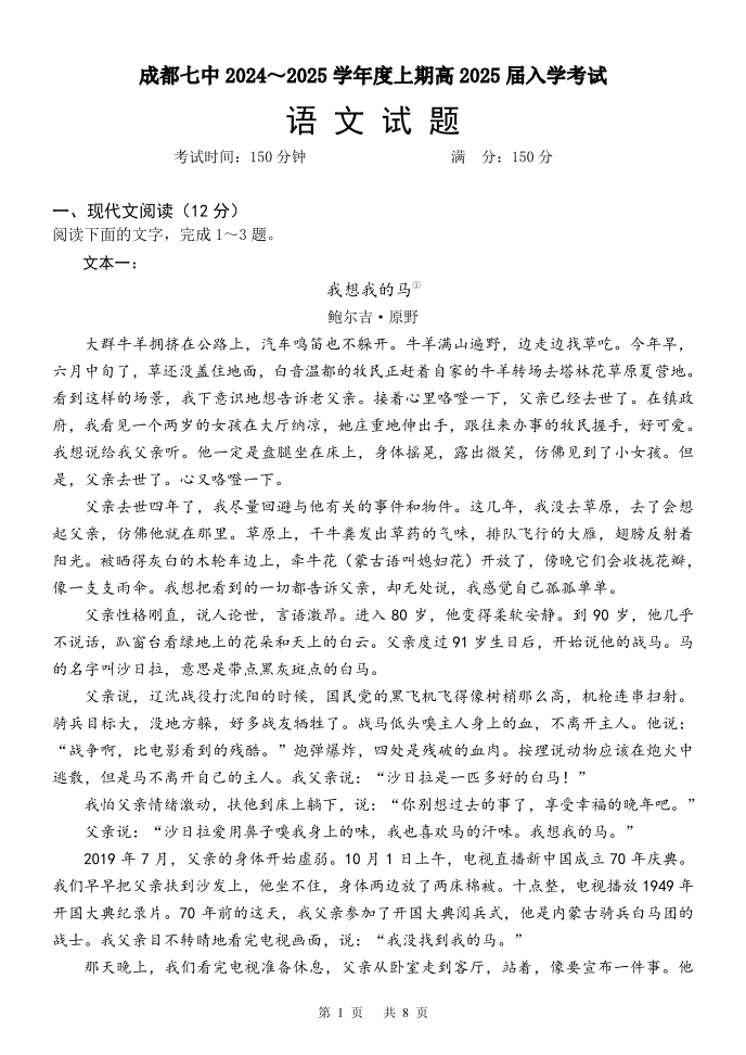 四川省成都市第七中学2024-2025学年度上期高2025届入学考试语文