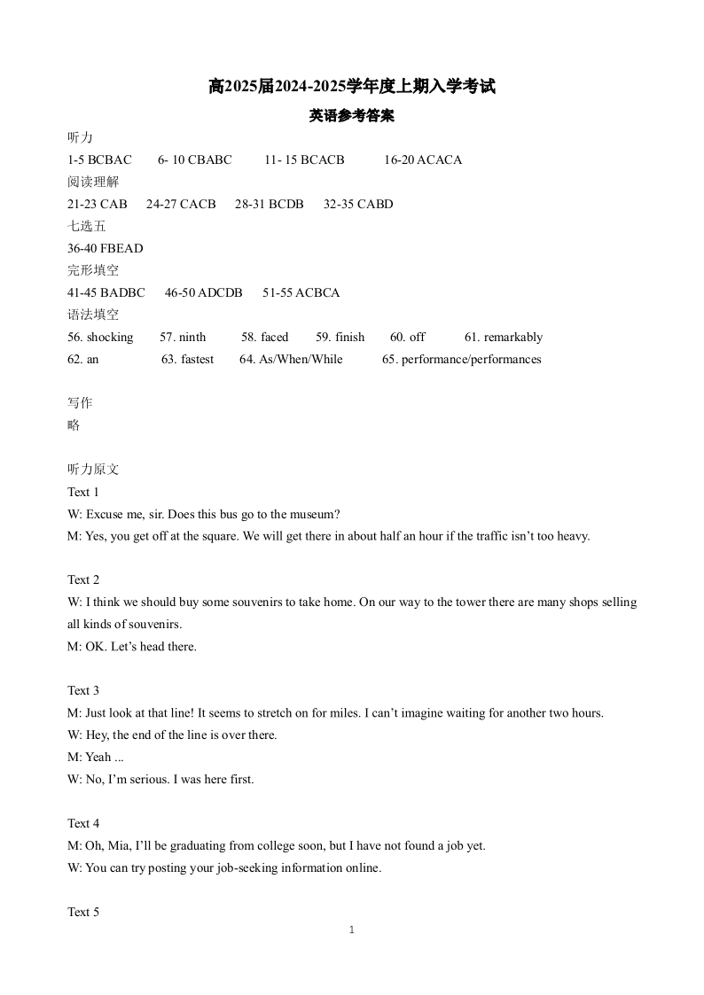 四川省成都市第七中学2024-2025学年度上期高2025届入学考试英语答案