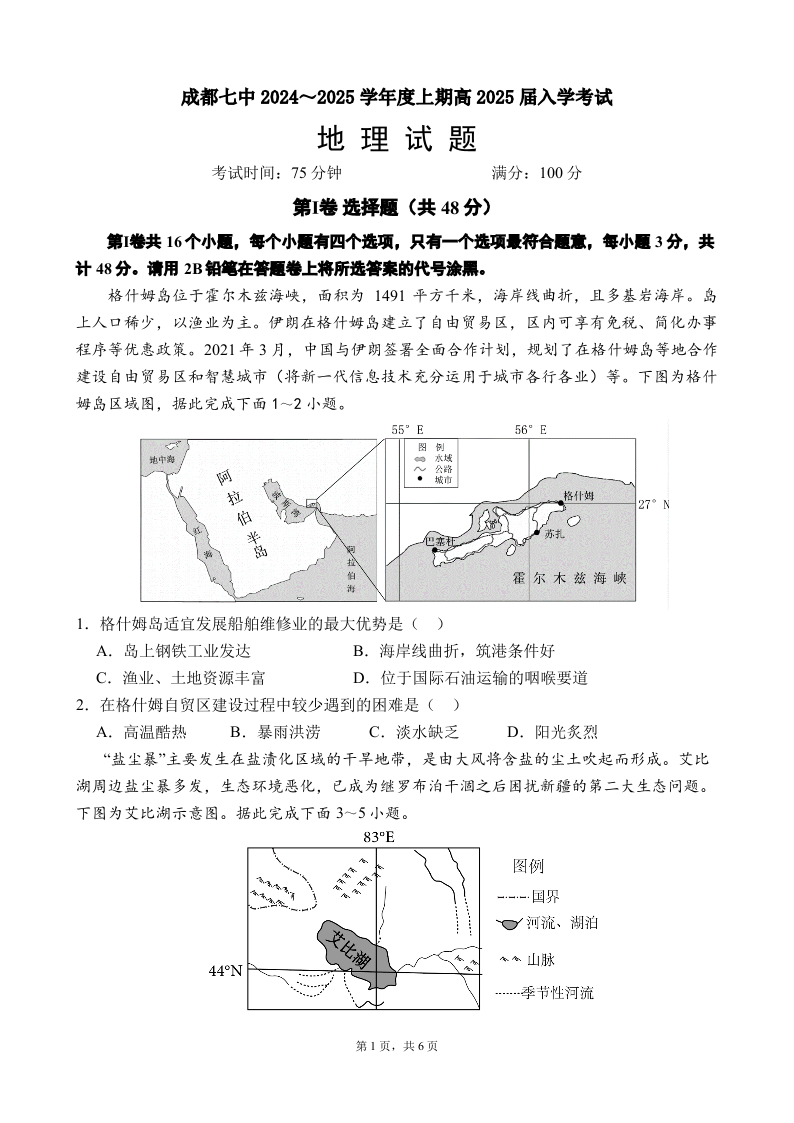 四川省成都市第七中学2024-2025学年度上期高2025届入学考试地理