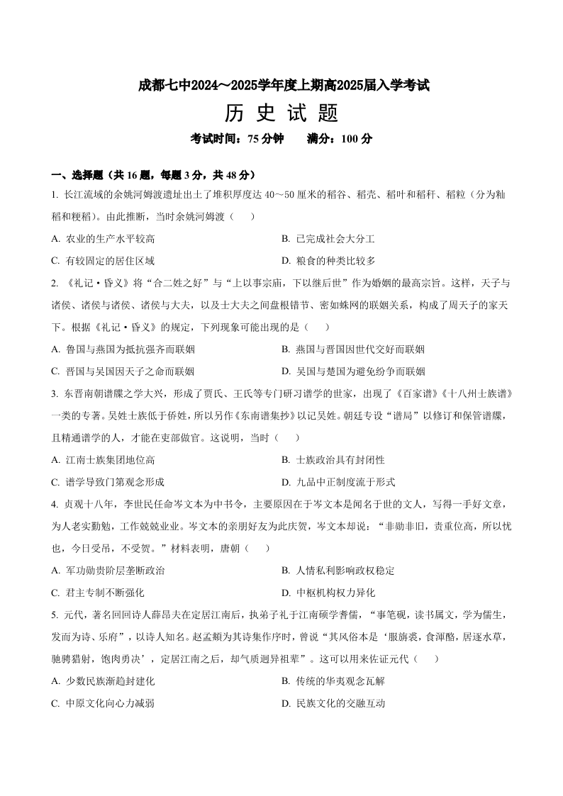 四川省成都市第七中学2024-2025学年度上期高2025届入学考试历史