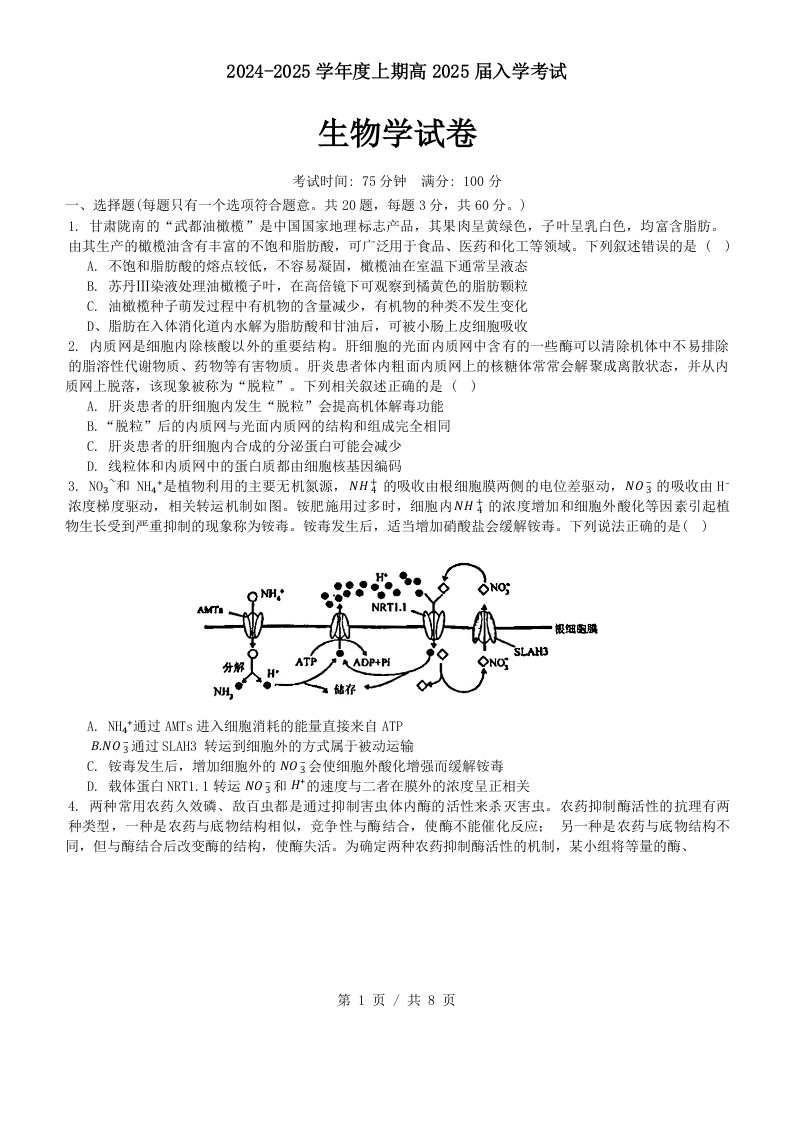 四川省成都市第七中学2024-2025学年度上期高2025届入学考试生物