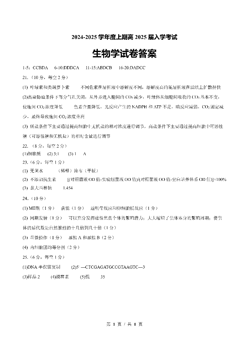 四川省成都市第七中学2024-2025学年度上期高2025届入学考试生物答案