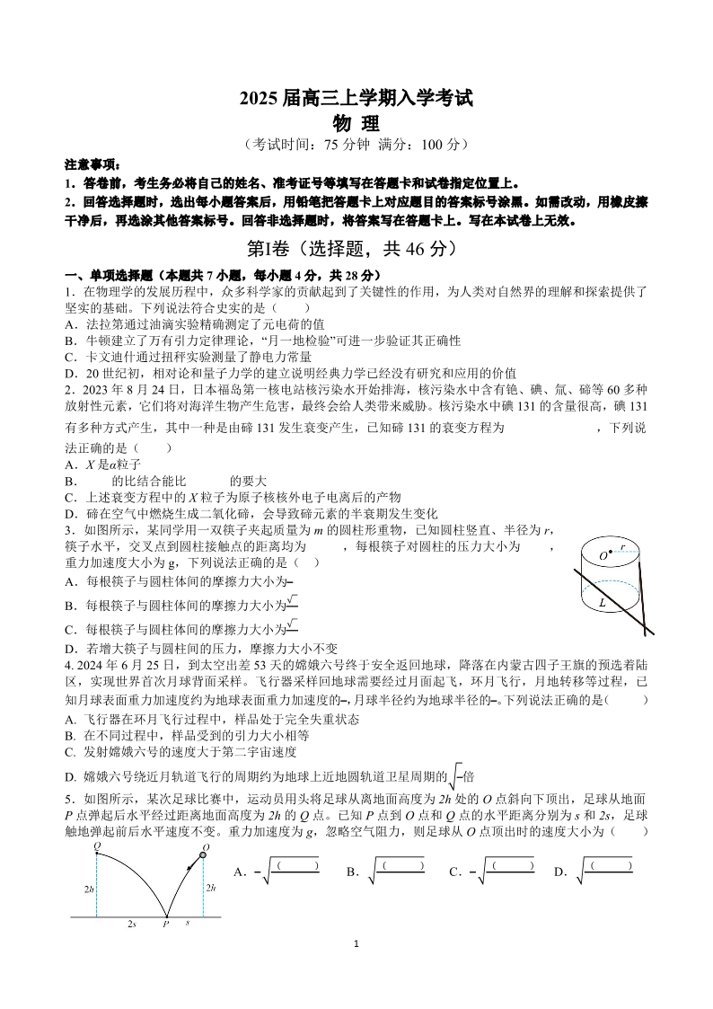 四川省成都市第七中学2024-2025学年度上期高2025届入学考试物理
