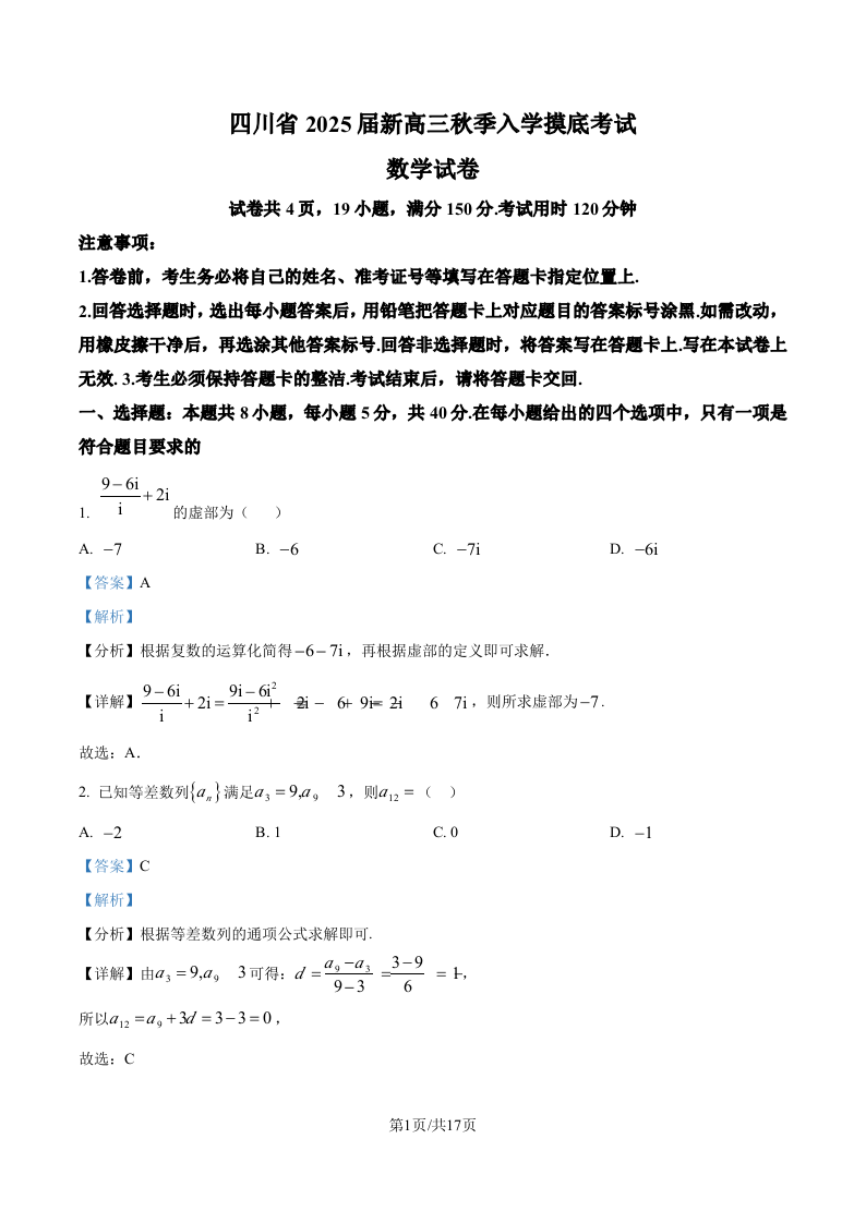 四川省2025届新高三秋季入学摸底考试数学试题(解析版)
