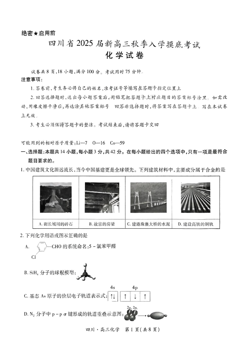 四川省2025届新高三秋季入学摸底考试化学