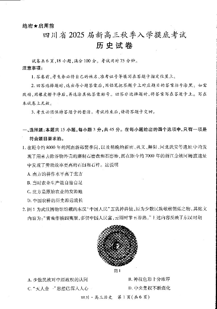 四川省2025届新高三秋季入学摸底考试历史