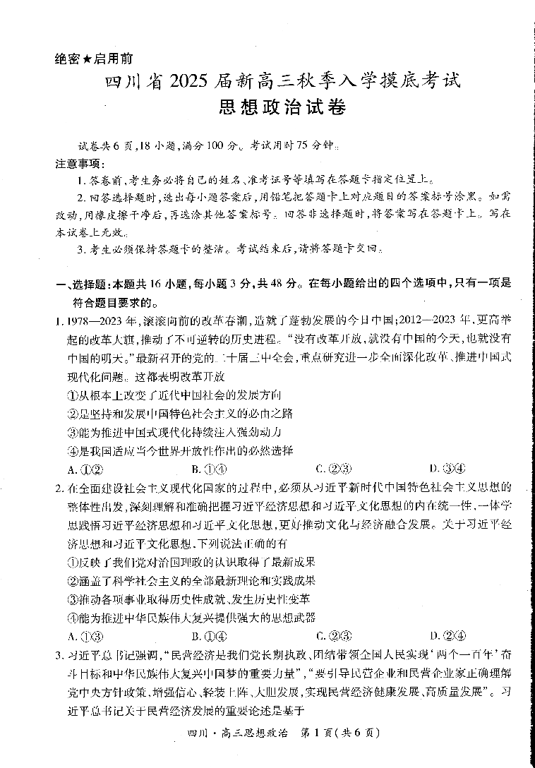 四川省2025届新高三秋季入学摸底考试政治