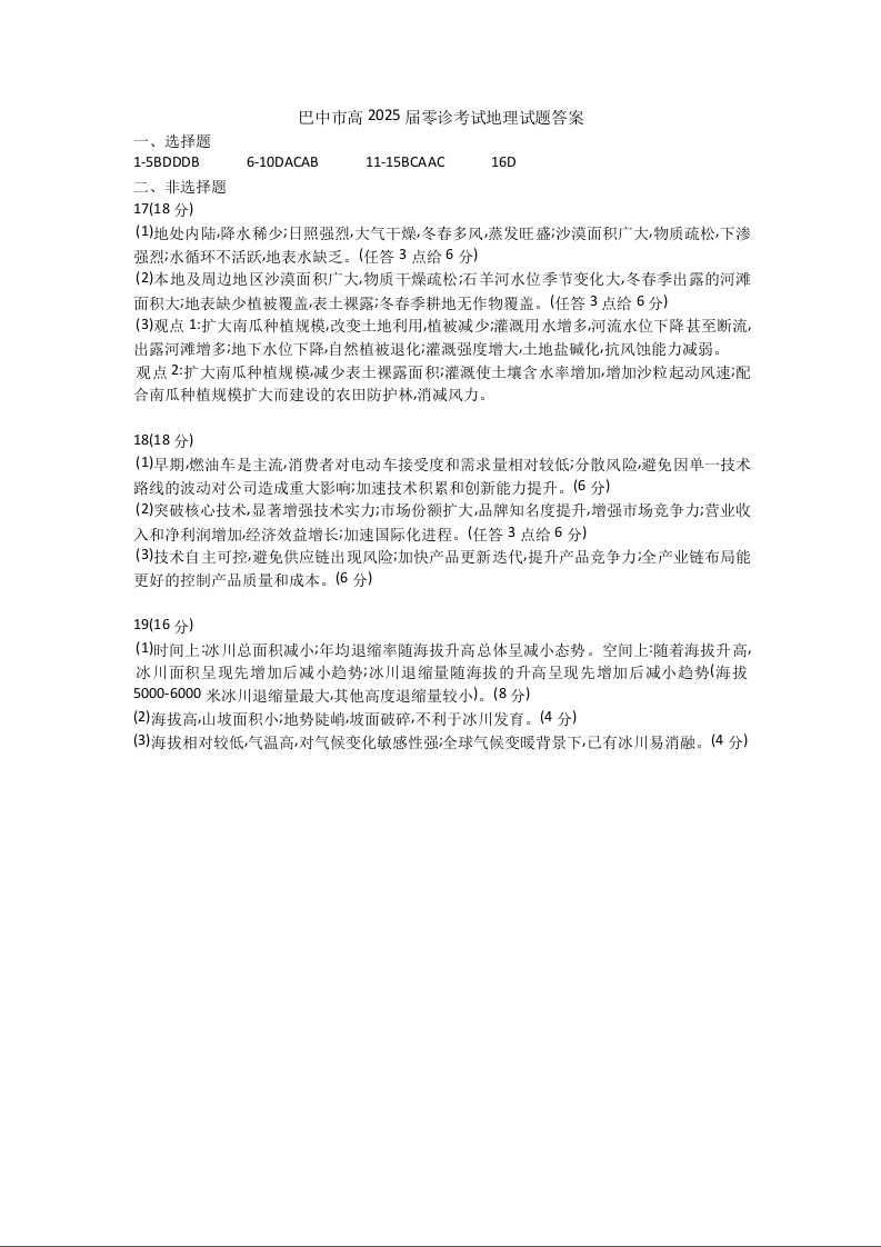 四川省巴中市普通高中2022级”零诊“考试地理答案