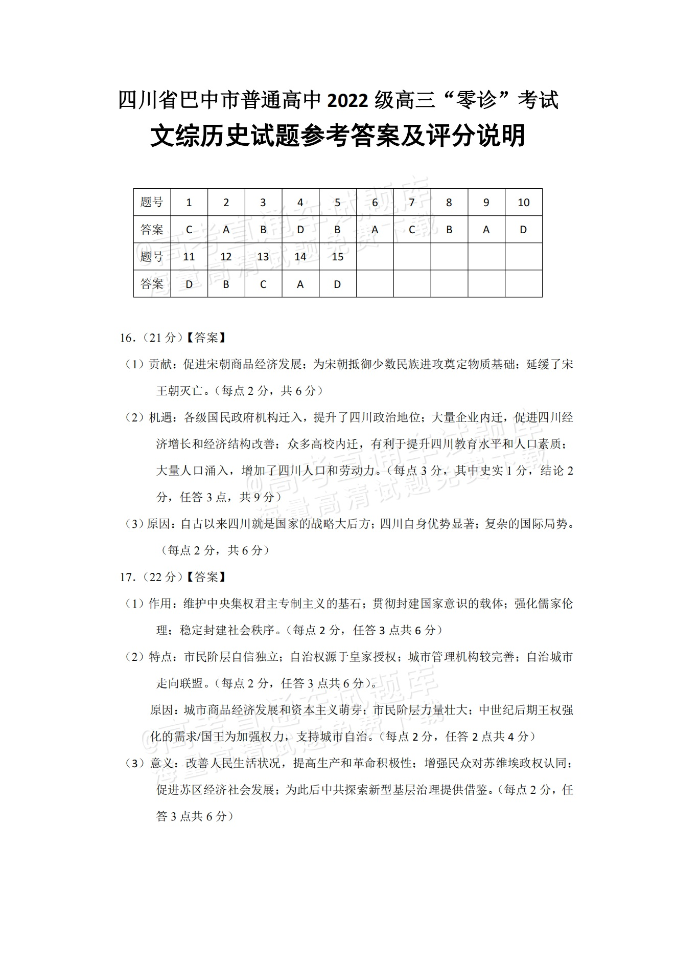四川省巴中市普通高中2022级”零诊“考试历史答案