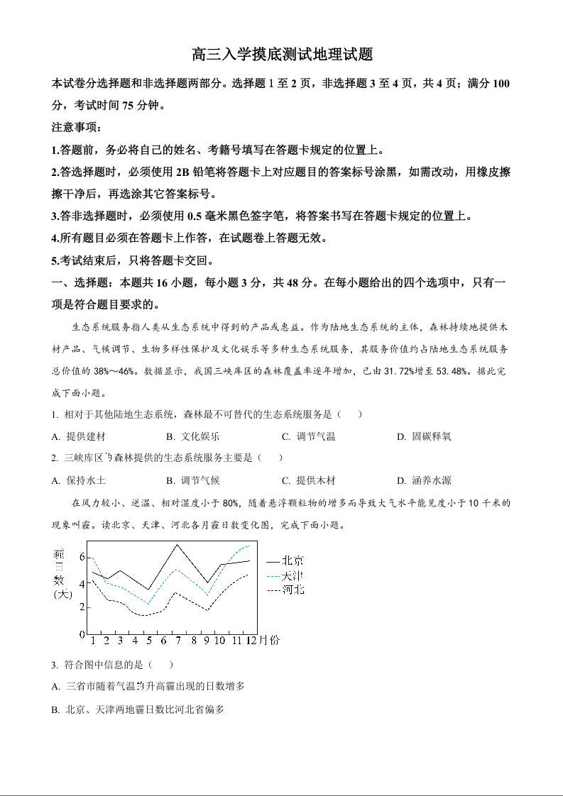 四川省成都列五中学2025届高三入学摸底测试地理试题(原卷版)
