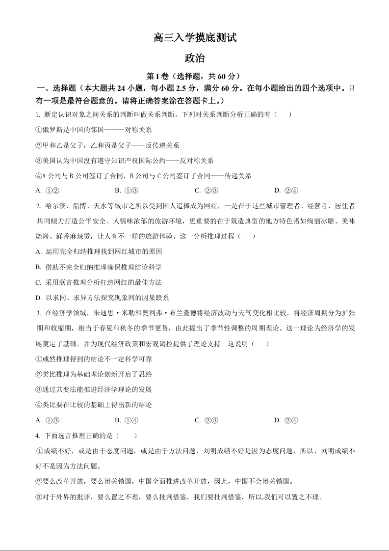 四川省成都列五中学2025届高三入学摸底测试政治试题(原卷版)