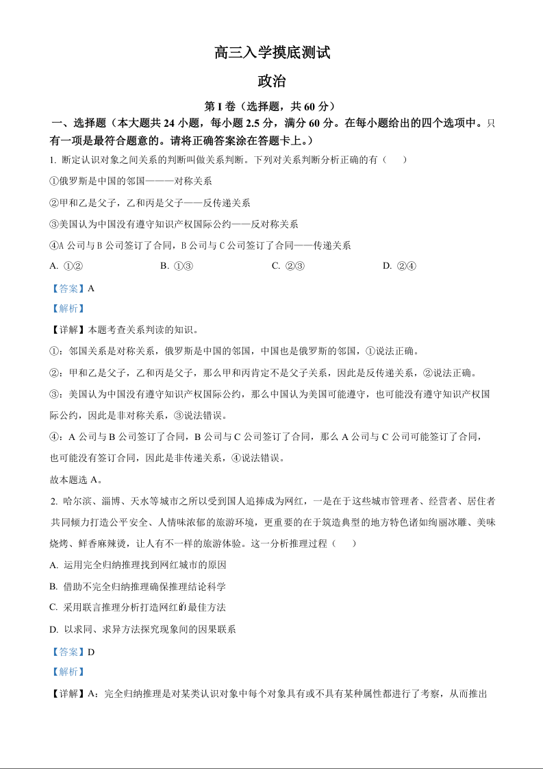 四川省成都列五中学2025届高三入学摸底测试政治试题(解析版)