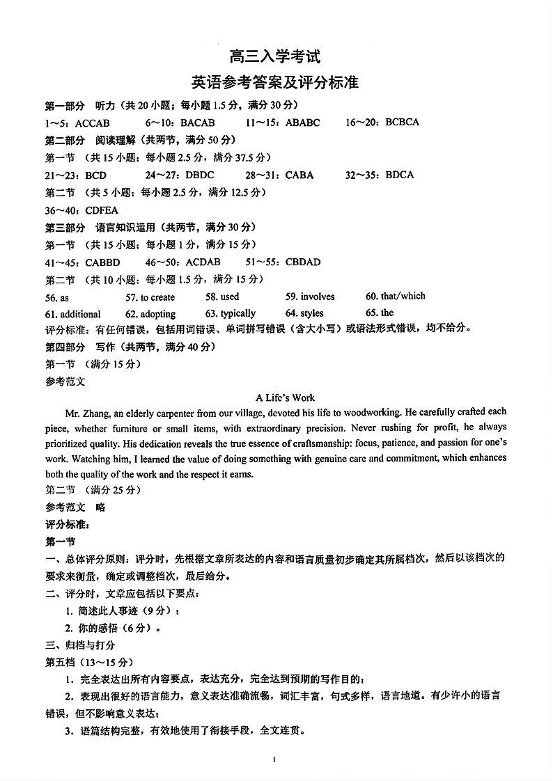 四川省成都市部分高中2025届高三上学期入学考试英语答案