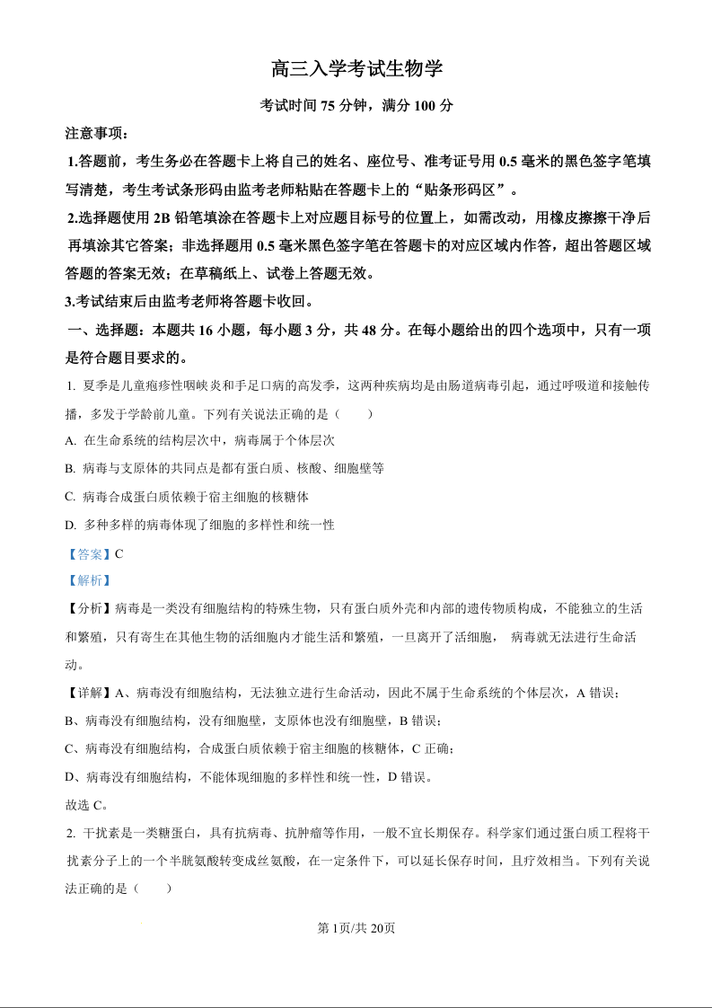 四川省成都市部分高中2025届高三上学期入学考试生物试题(解析版)