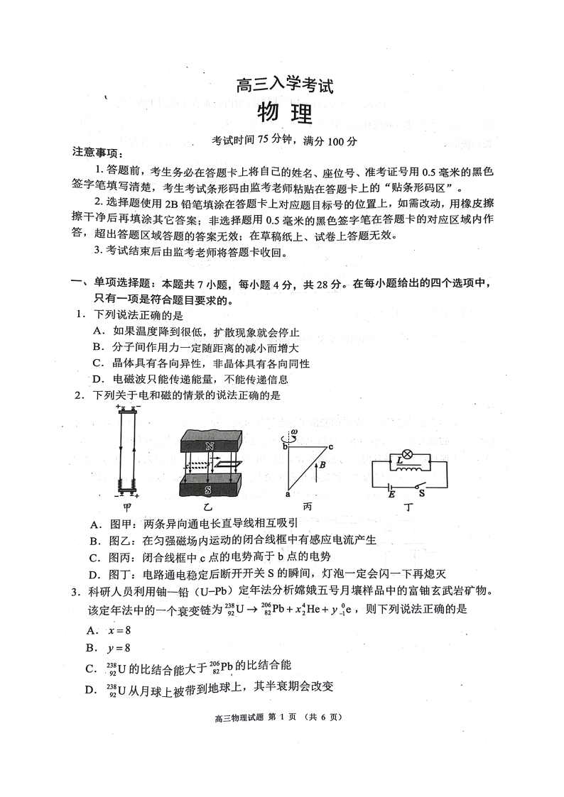 四川省成都市部分高中2025届高三上学期入学考试物理试
