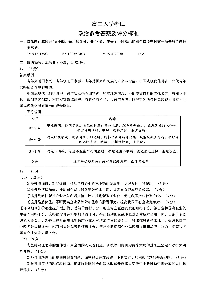 四川省成都市部分高中2025届高三上学期入学考试政治答案