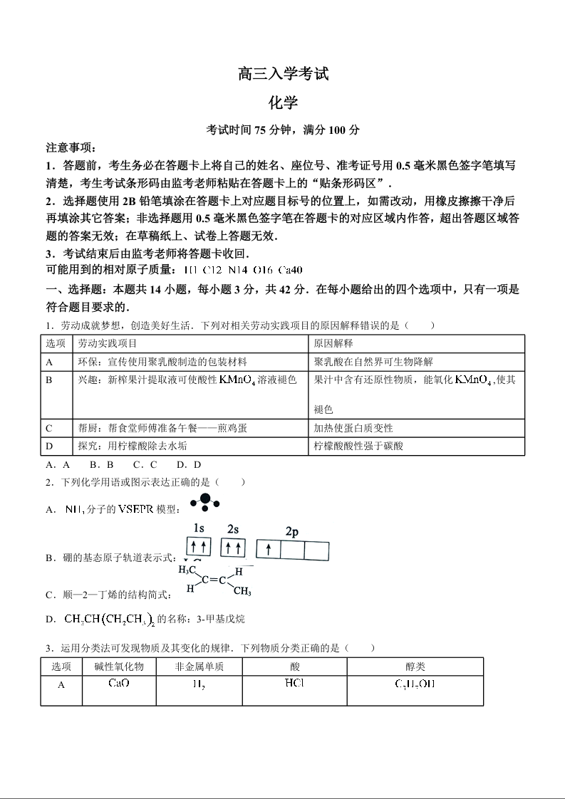 四川省成都市部分高中2025届高三上学期入学考试化学+答案