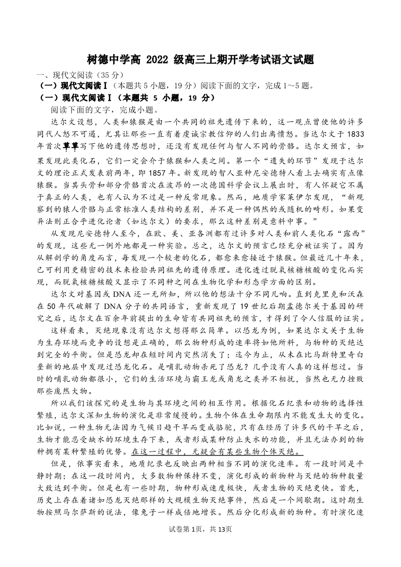 四川省成都市树德中学高2022级高三开学考试语文+答案