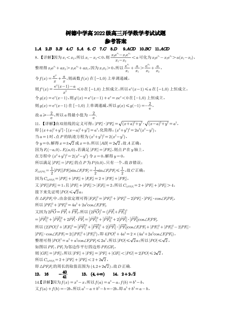 四川省成都市树德中学高2022级高三开学考试数学答案