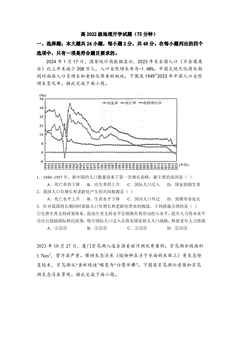 四川省成都市树德中学高2022级高三开学考试地理+答案