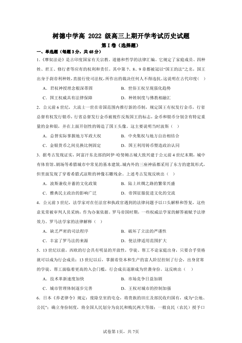 四川省成都市树德中学高2022级高三开学考试历史+答案