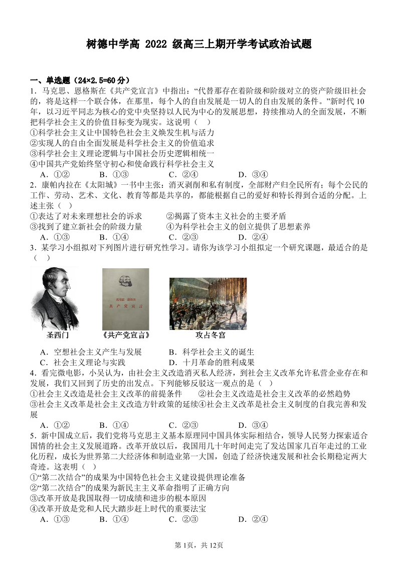 四川省成都市树德中学高2022级高三开学考试政治+答案